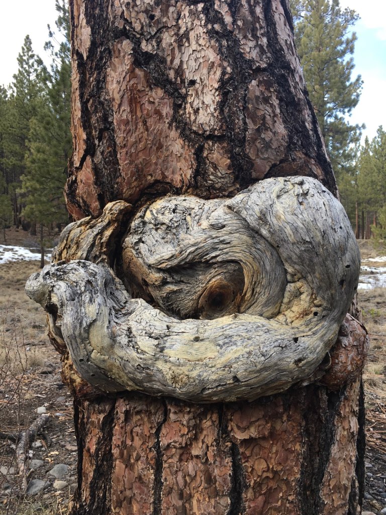 On the edge of the trail was a man, tucked into the hollow of a tree. All we could see was head, shoulder, and arm. His head buried in the curve of his elbow, hair partially covering his weathered face, and his lips clenched forming a thin frown. His large muscular shoulder protruded from the stump. His left arm embraced the tree’s bark. It was difficult to tell if he was trying to brace himself from falling deeper into the hole or pushing to fully disappear.