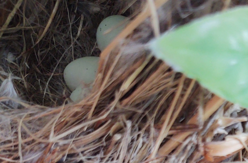 And there it was, a small nest with three blue speckled eggs resting amongst twigs and dry grass.