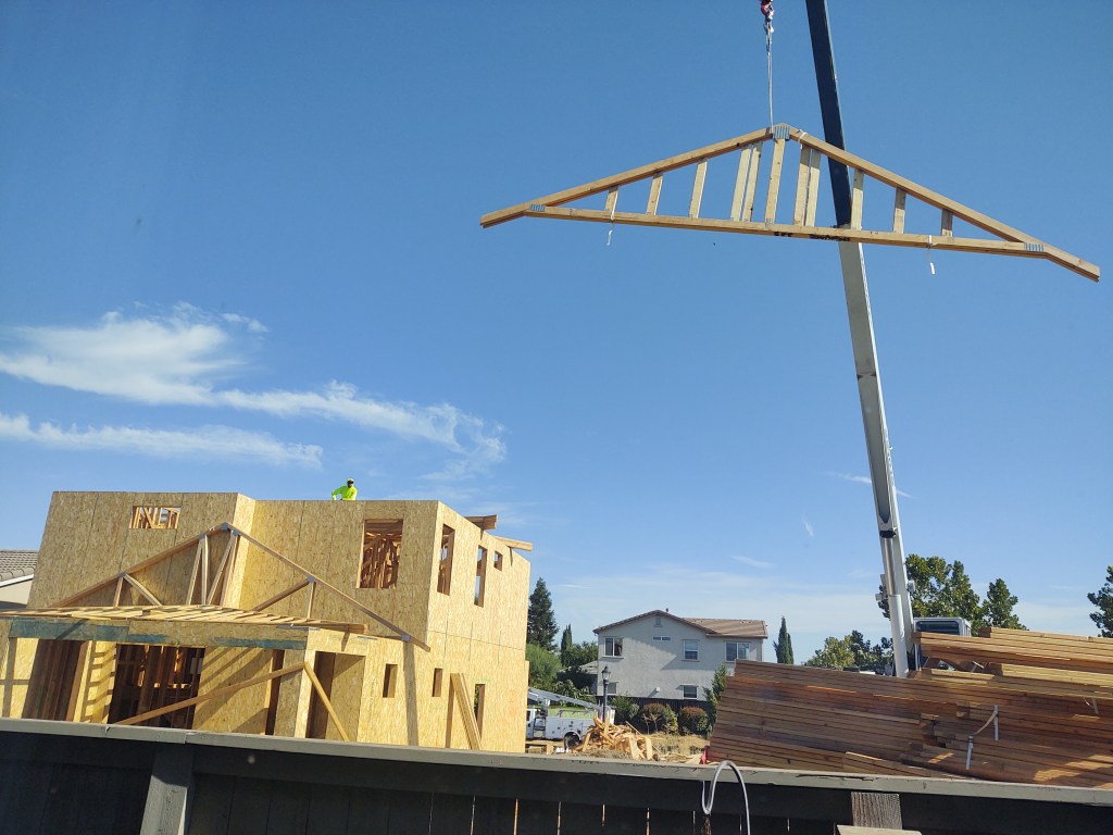 My home office window has a bird’s eye view of the construction in the adjacent empty lot. From clearing the land to pouring the foundation, the initial house framing to the crane placing the roof eves, it’s been quite the process and it’s only the start.